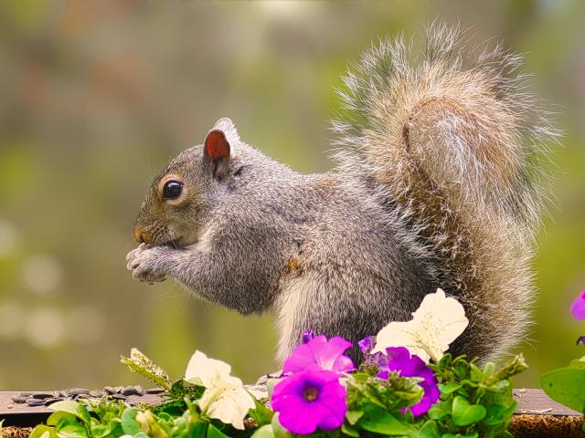Wallpaper Little squirrel chewing on a nut near the petunia flowers