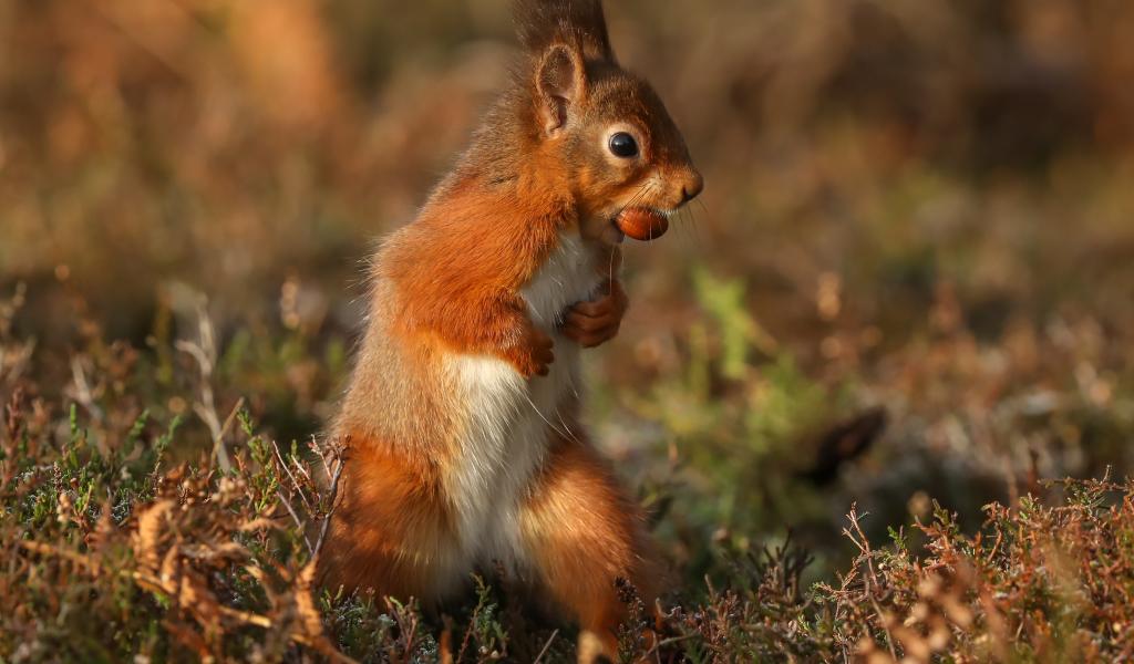 Wallpaper Red squirrel stands with a nut in its teeth on the grass