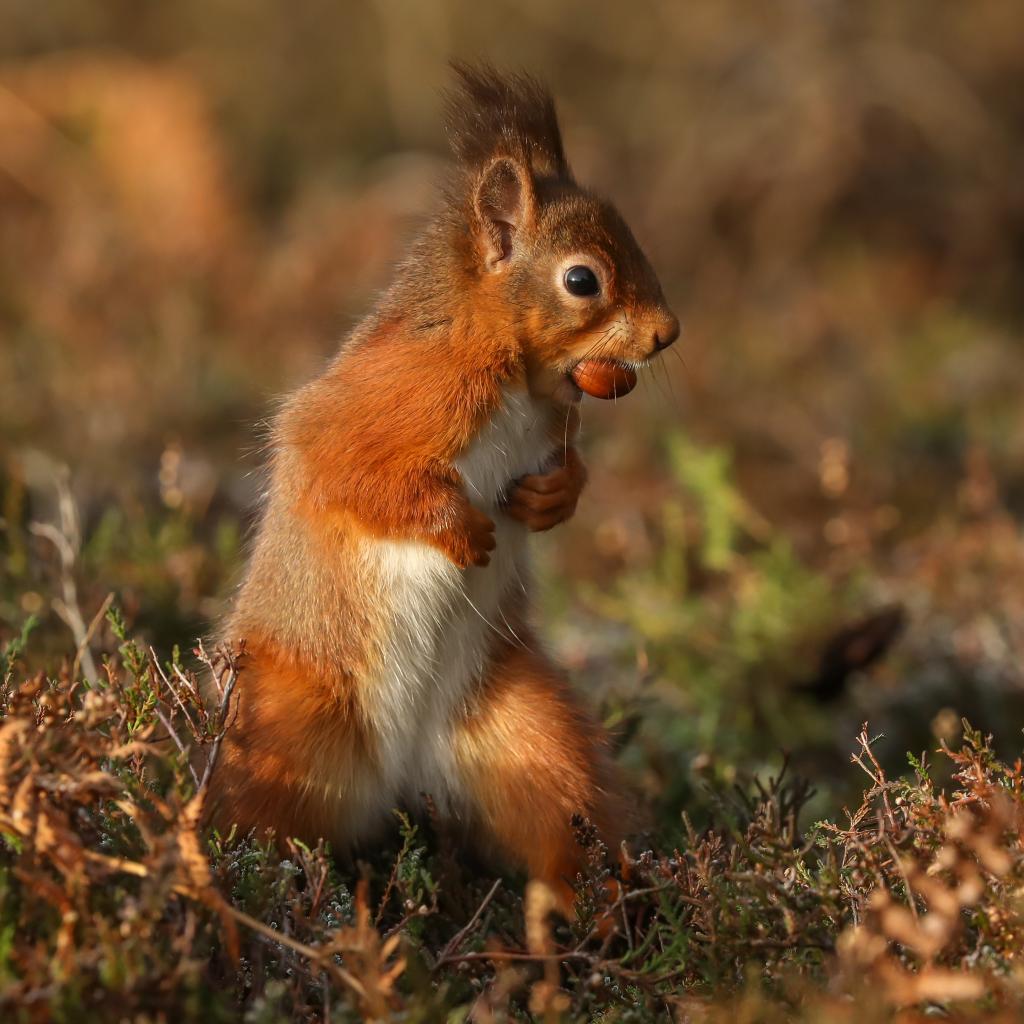 Wallpaper Red squirrel stands with a nut in its teeth on the grass