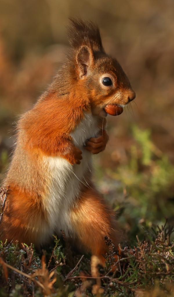 Wallpaper Red squirrel stands with a nut in its teeth on the grass