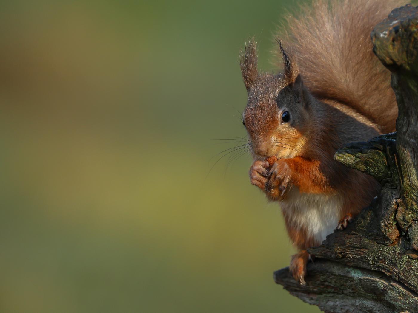 Wallpaper Fluffy red squirrel nibbles a nut on a tree