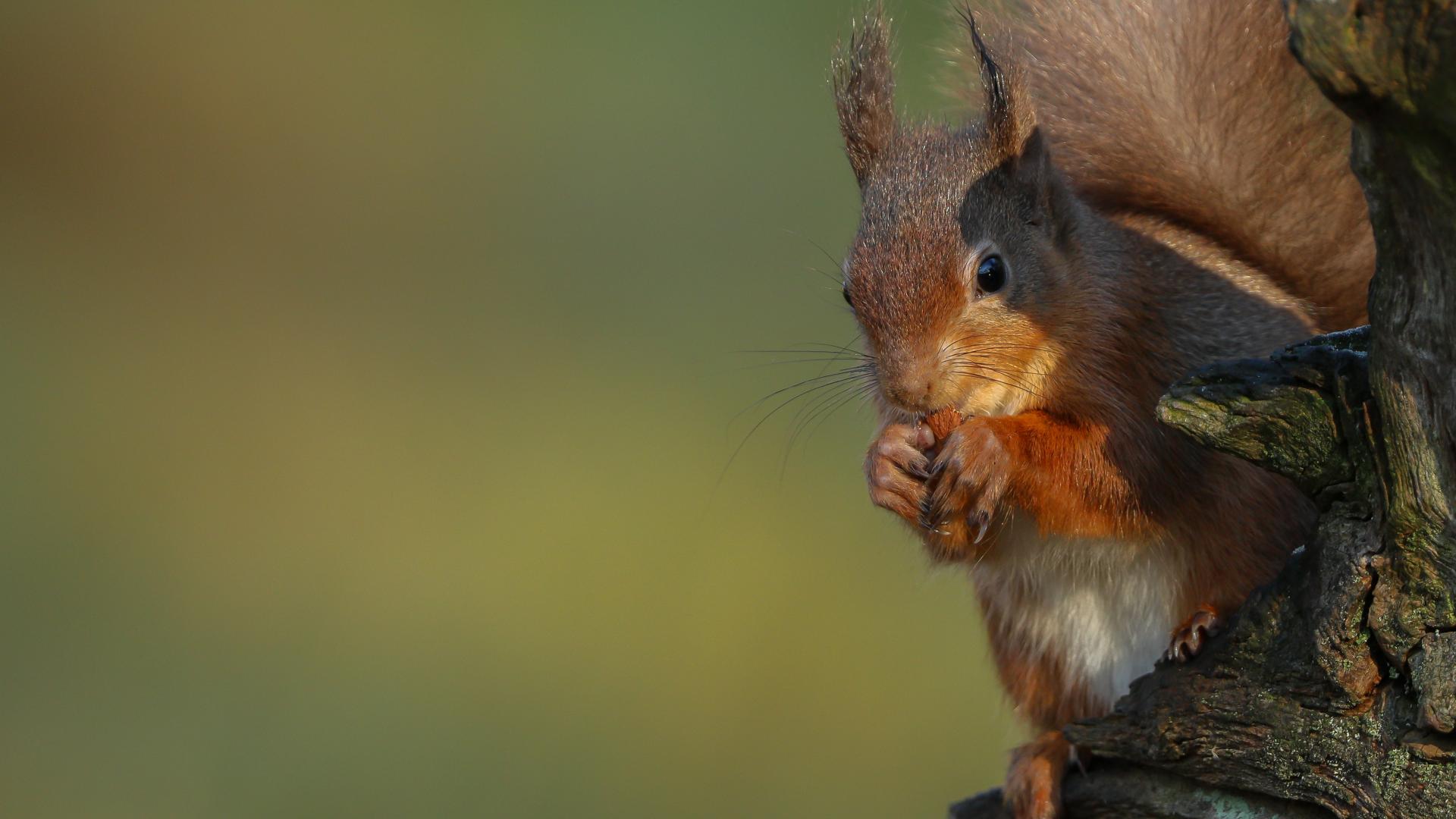 Wallpaper Fluffy red squirrel nibbles a nut on a tree