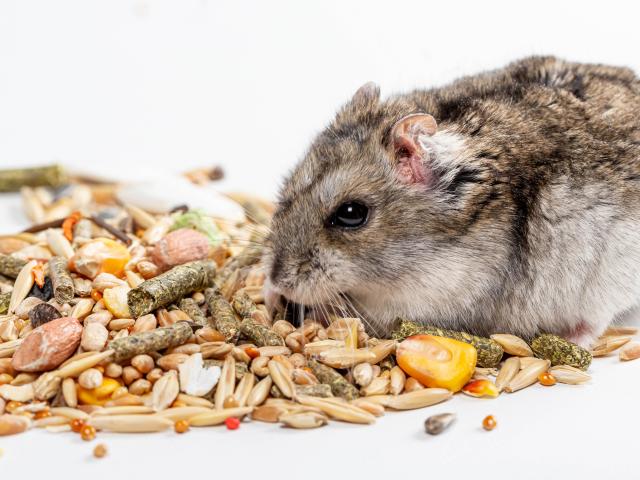 Wallpaper Little hamster nibbles food on a white background