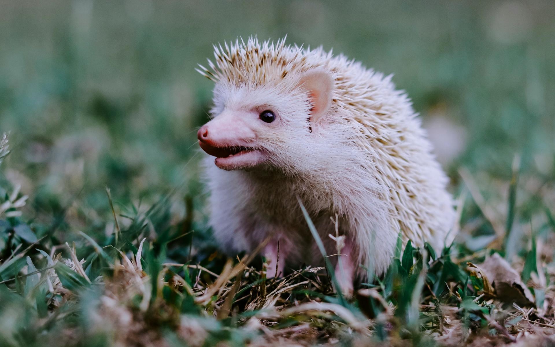 Wallpaper Funny white hedgehog on green grass