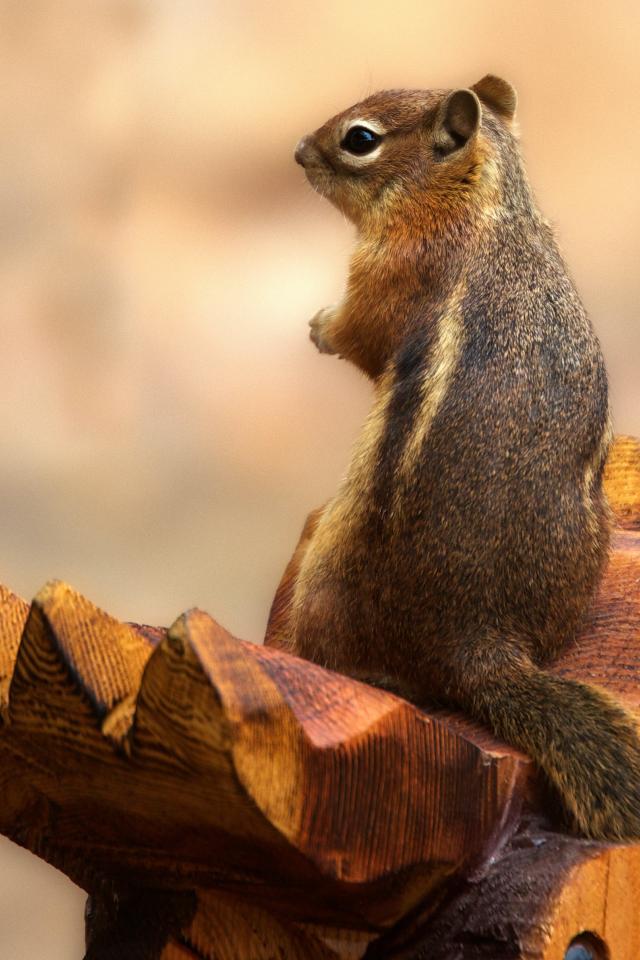 Wallpaper Chipmunk sits on a wooden sculpture