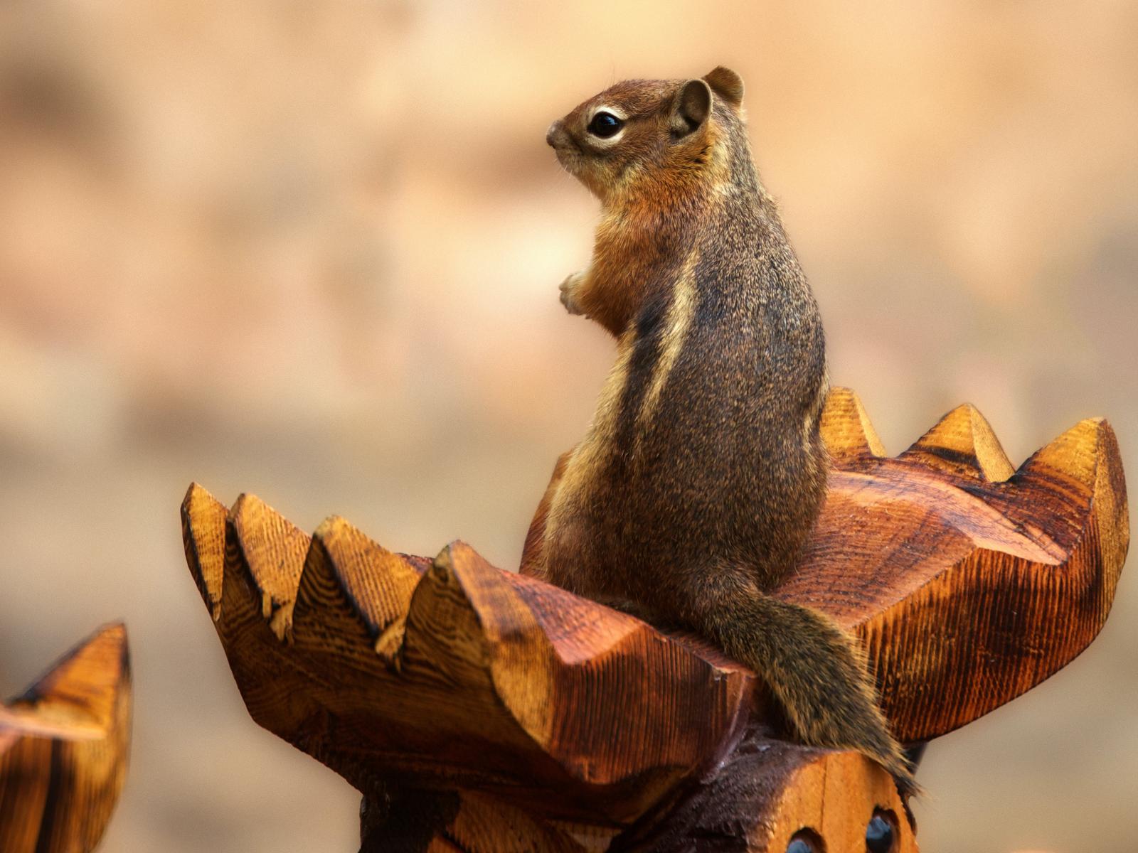 » Wallpaper Chipmunk sits on a wooden sculpture