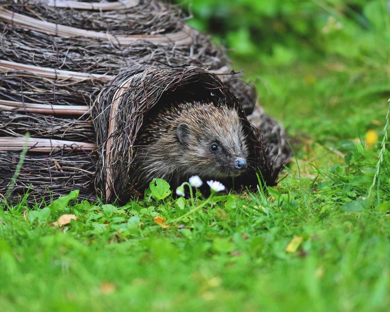 Wallpaper A small spiny hedgehog crawls out of the house