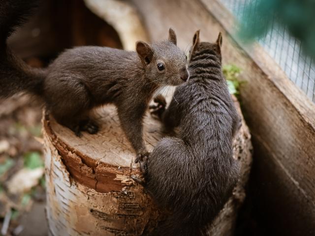 Wallpaper Two squirrels on a tree stump in a cage at the zoo