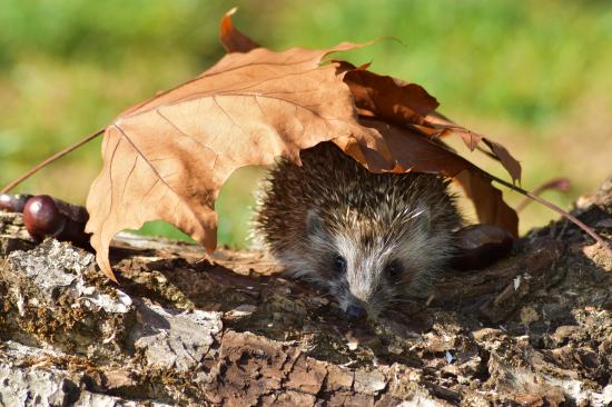 Wallpaper Spiny hedgehog hides under fallen leaves