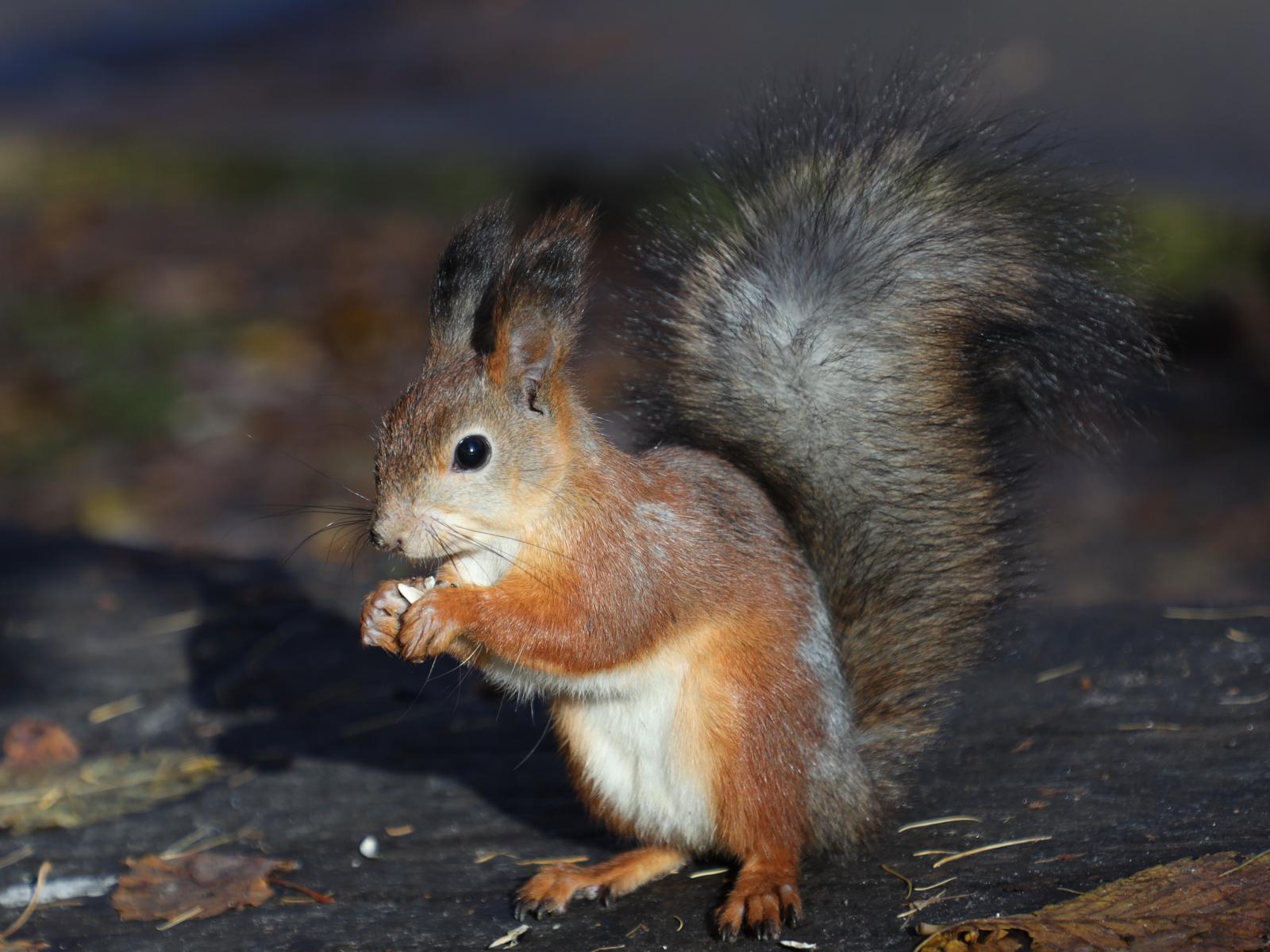 Wallpaper A small red squirrel gnaws a nut in the yellow leaves