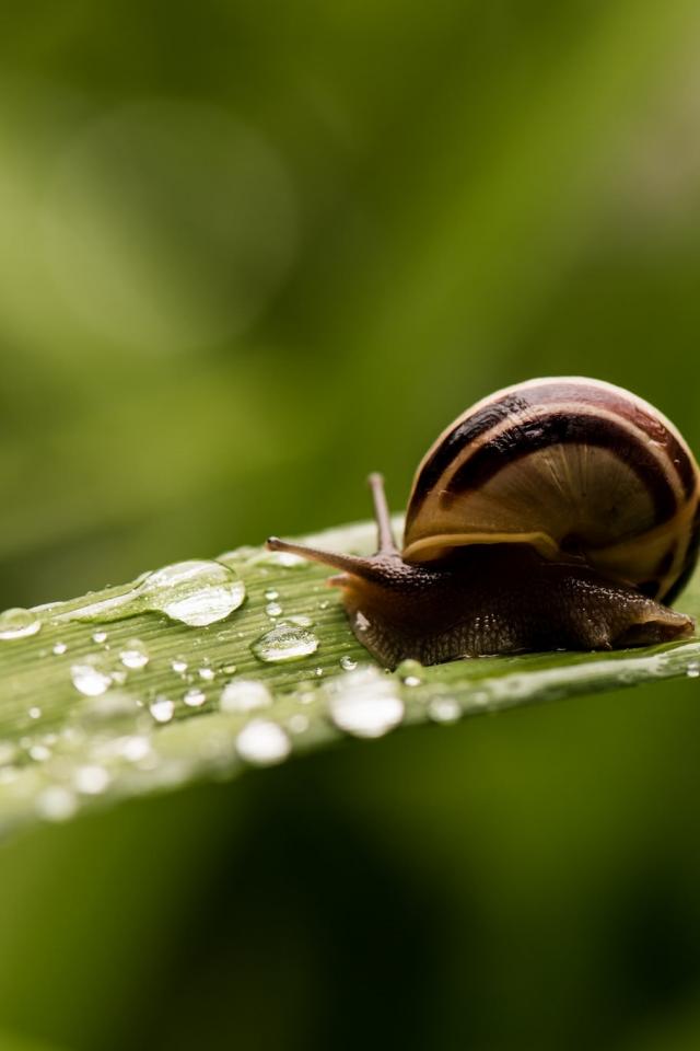 Wallpaper A snail sits on a dew-covered green leaf
