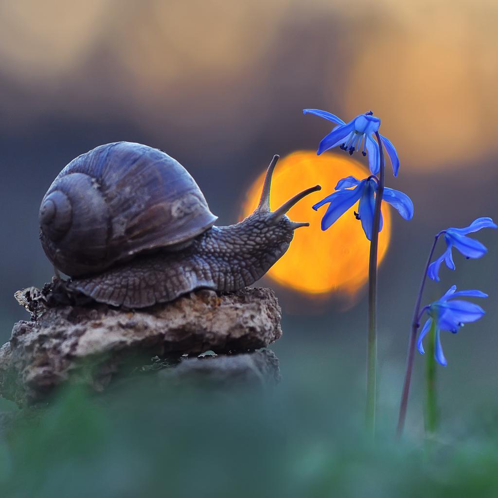 Wallpaper Snail sits on a stone near a blue flower