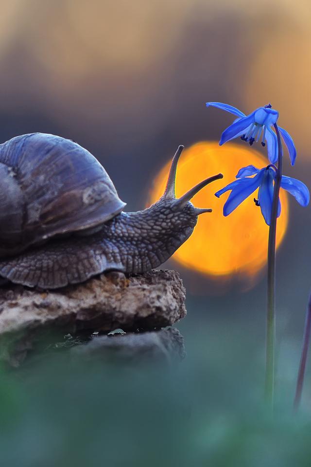 Wallpaper Snail sits on a stone near a blue flower