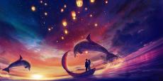 Wallpaper Couple in love on a boat in the water with dolphins