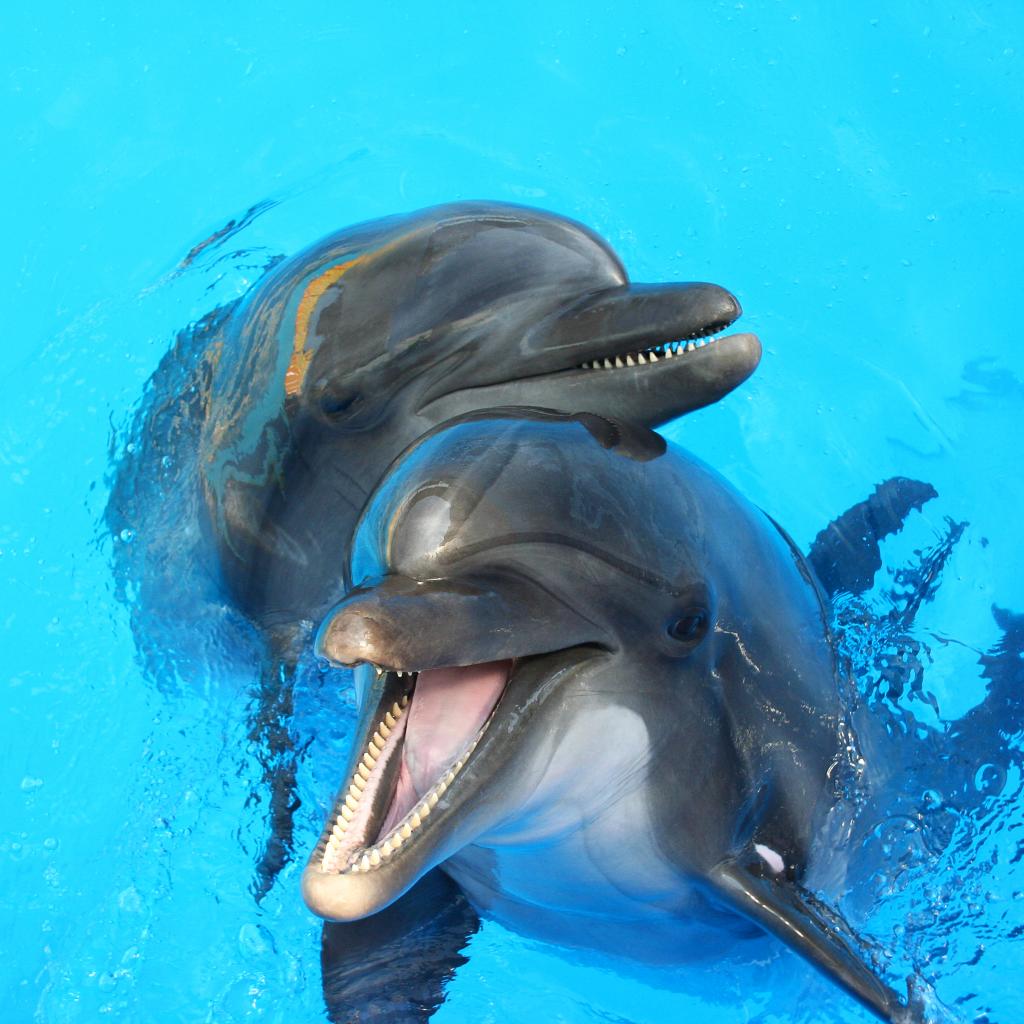 Wallpaper Three dolphins jump out of the water against the blue sky