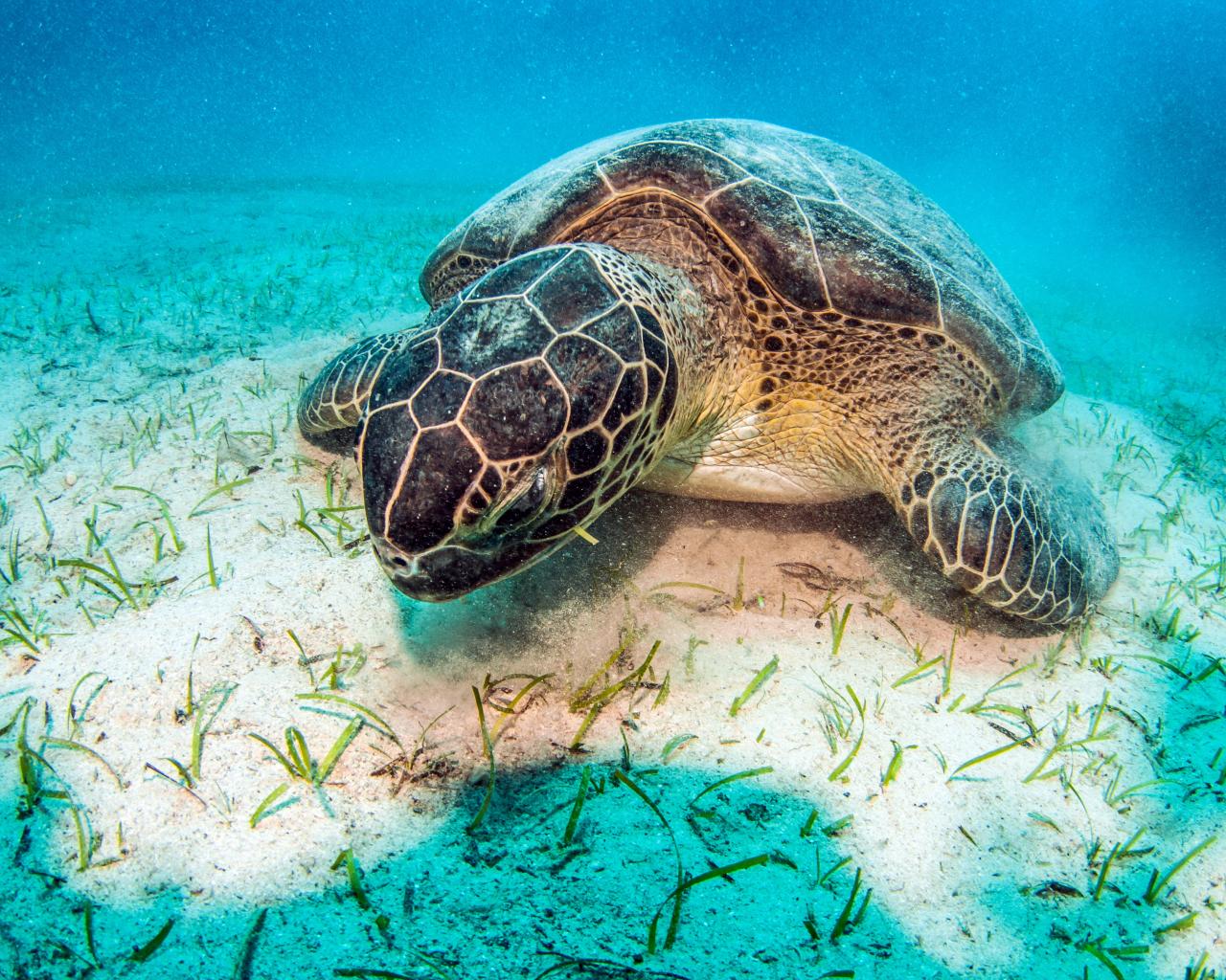 Wallpaper A large turtle lies under the water at the bottom