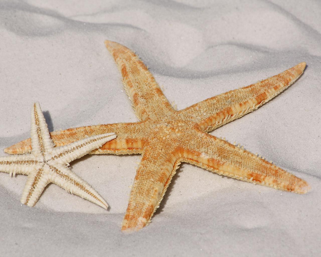 Wallpaper Three orange starfish on the yellow sand to the sea