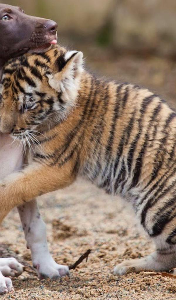 Wallpaper Little Puppy and Tiger Cuddle