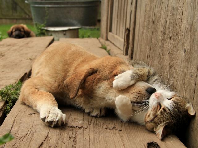 Wallpaper A sleeping cat hugs a dog by the muzzle