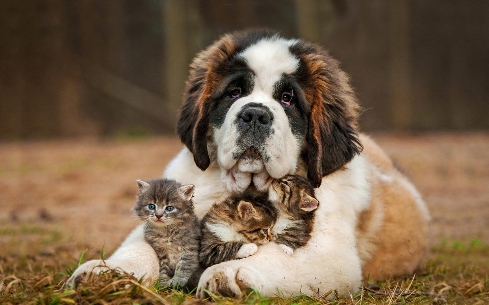 Wallpaper Big St. Bernard with three little kittens