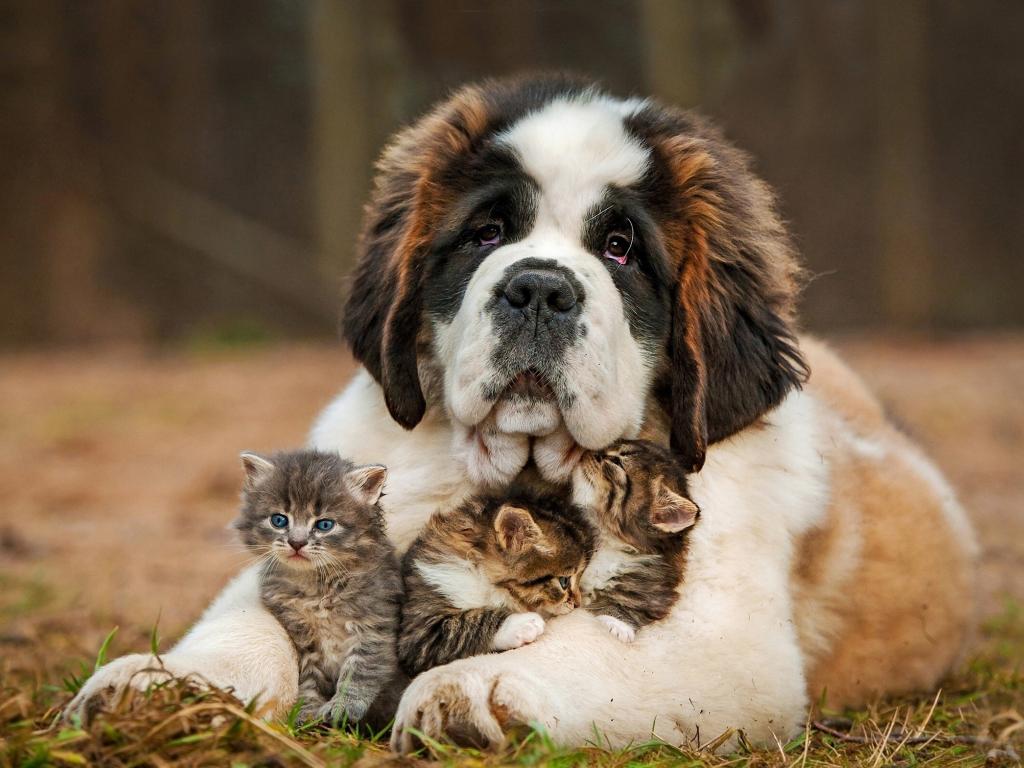 Wallpaper Big St. Bernard with three little kittens