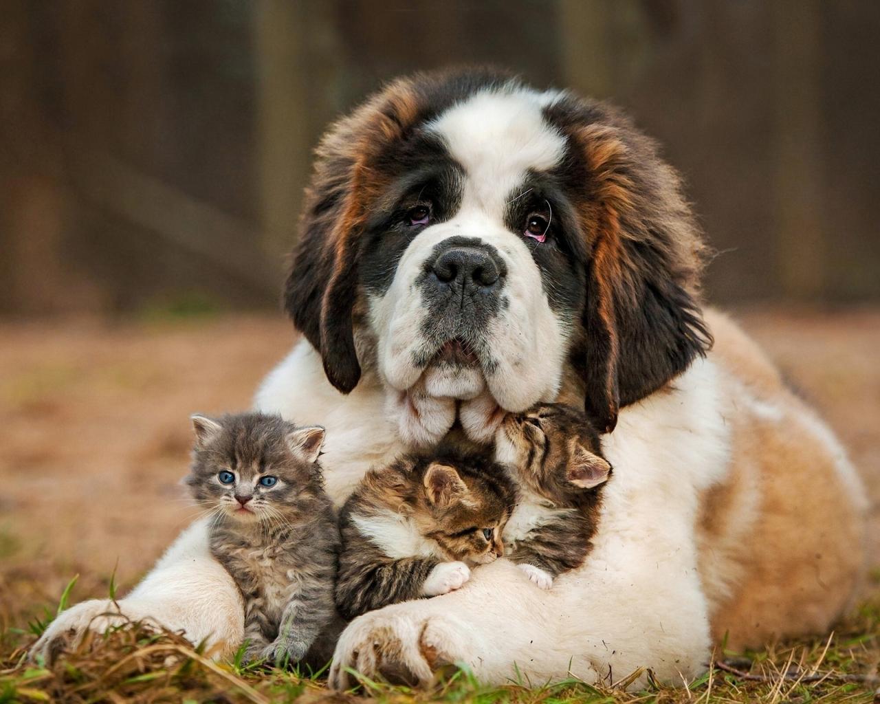 Wallpaper Big St. Bernard with three little kittens