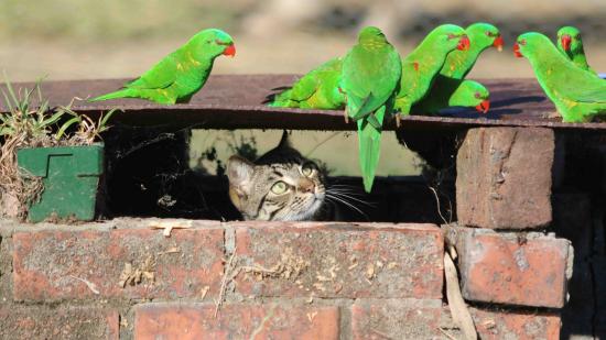 Wallpaper Gray cat watches for green parrots