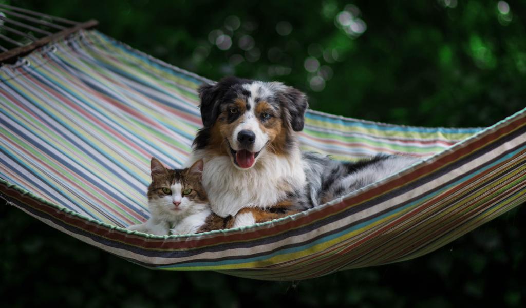 Wallpaper A dog and a cat lie in a hammock