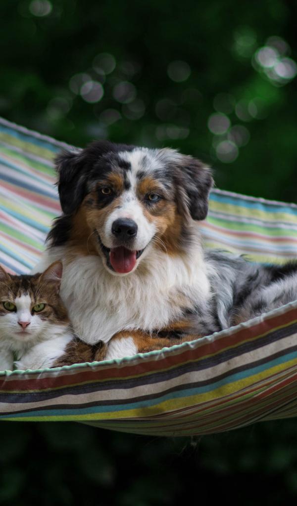 Wallpaper A dog and a cat lie in a hammock