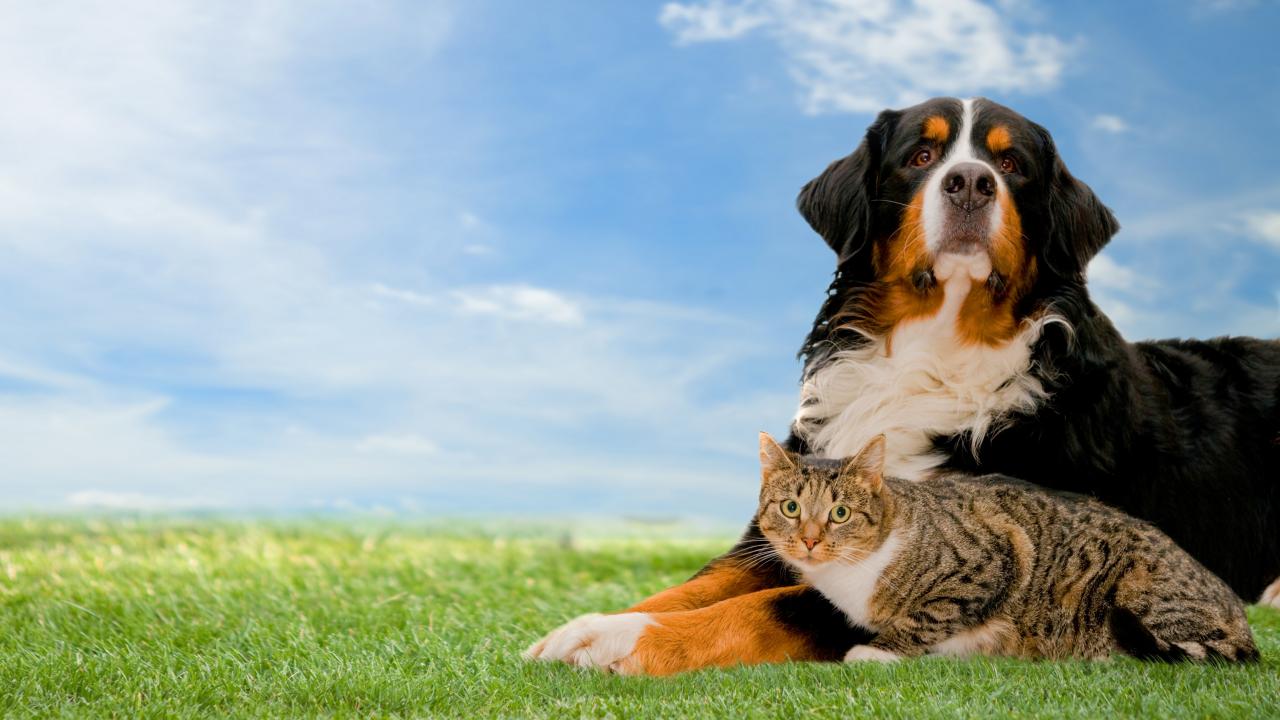 Wallpaper Bernese Mountain Dog with gray cat on the grass