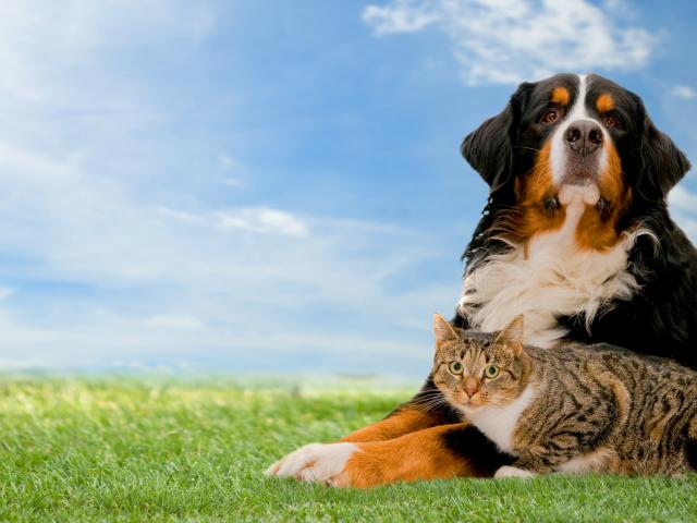 Wallpaper Bernese Mountain Dog with gray cat on the grass