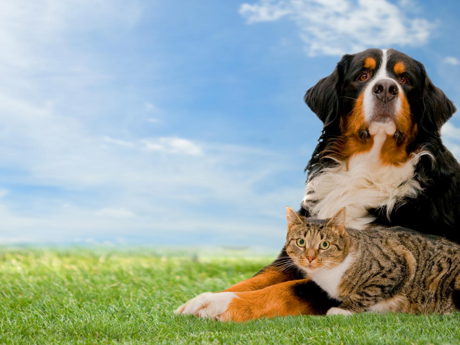 Wallpaper Bernese Mountain Dog with gray cat on the grass