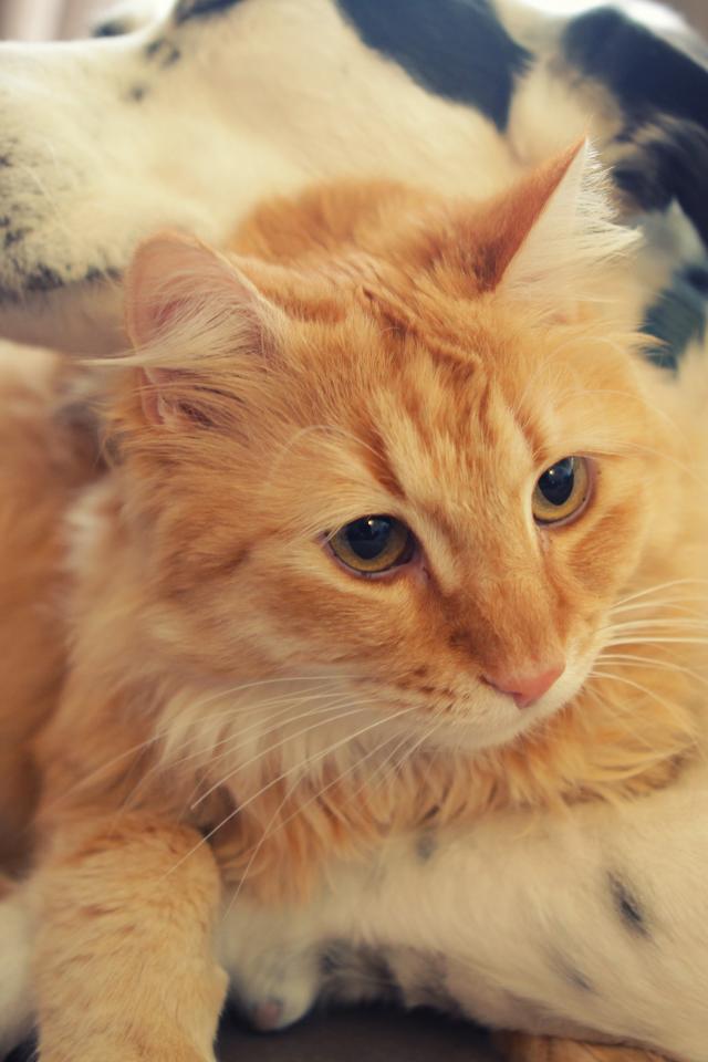 Wallpaper Big red cat lies with the dog