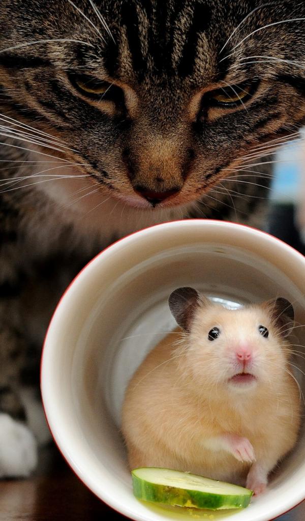 Wallpaper Hamster hiding in a cup from a gray cat