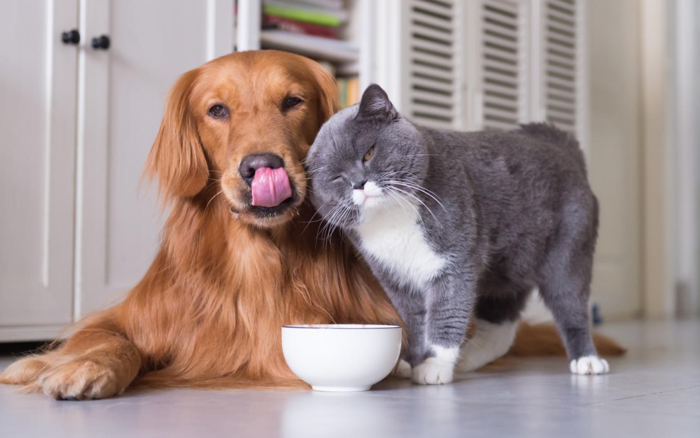 Wallpaper Big purebred cat with a red dog drink milk
