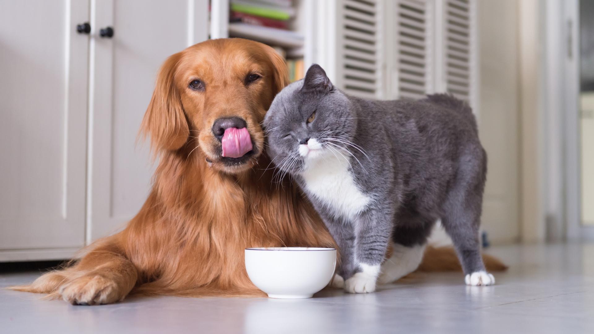 Wallpaper Big purebred cat with a red dog drink milk