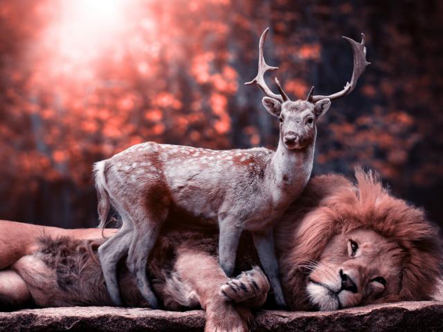 Wallpaper Big lion lies on the ground with a deer