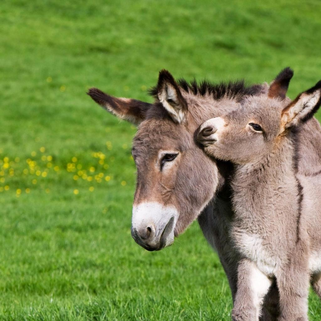 Wallpaper Little donkey with mom on green grass
