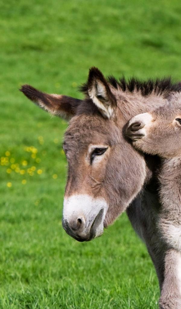 Wallpaper Little donkey with mom on green grass