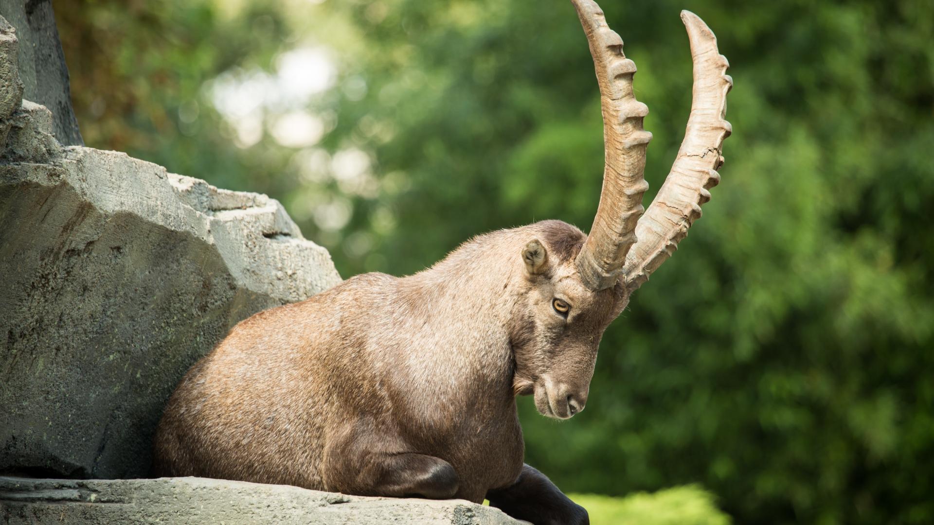 Wallpaper A mountain goat with large horns lies on a rock