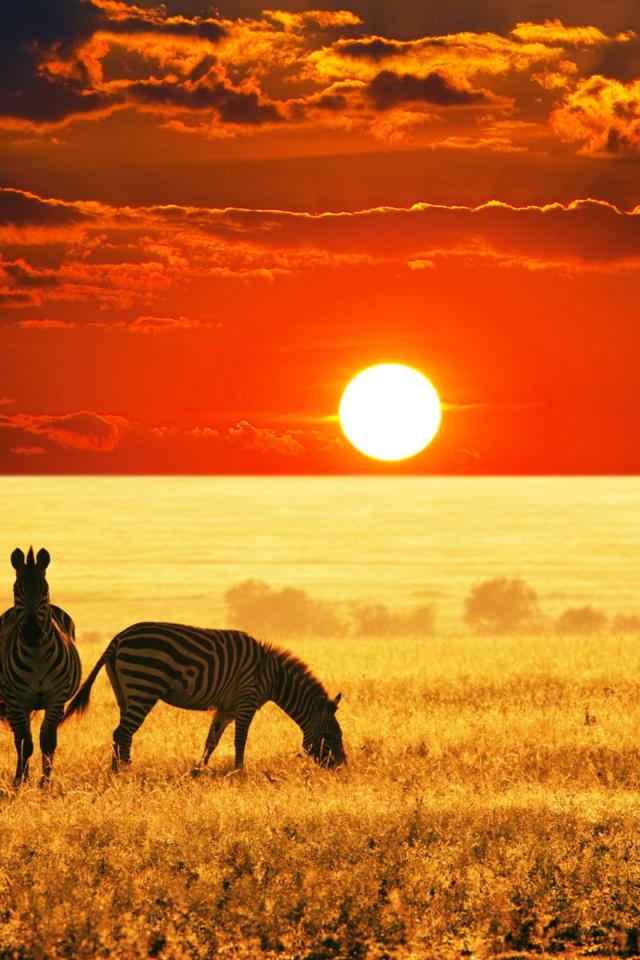 Wallpaper A herd of zebras grazes in the savannah at sunset