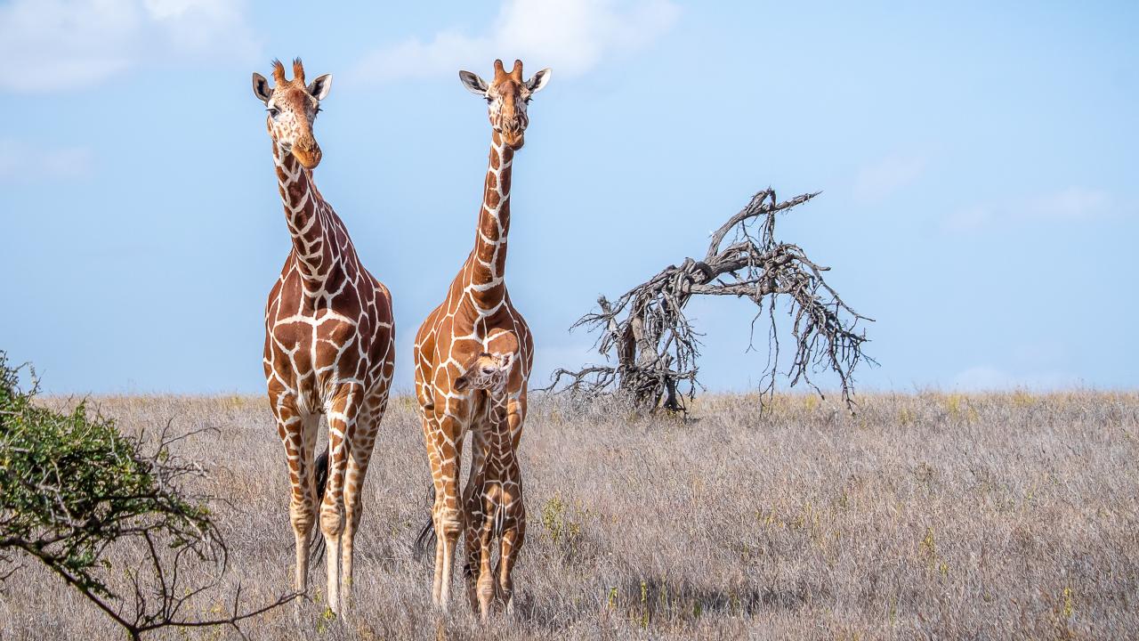Wallpaper Two giraffes walk on the dry grass in the savannah