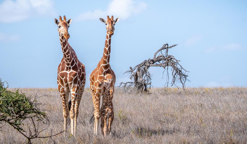 Wallpaper Two giraffes walk on the dry grass in the savannah