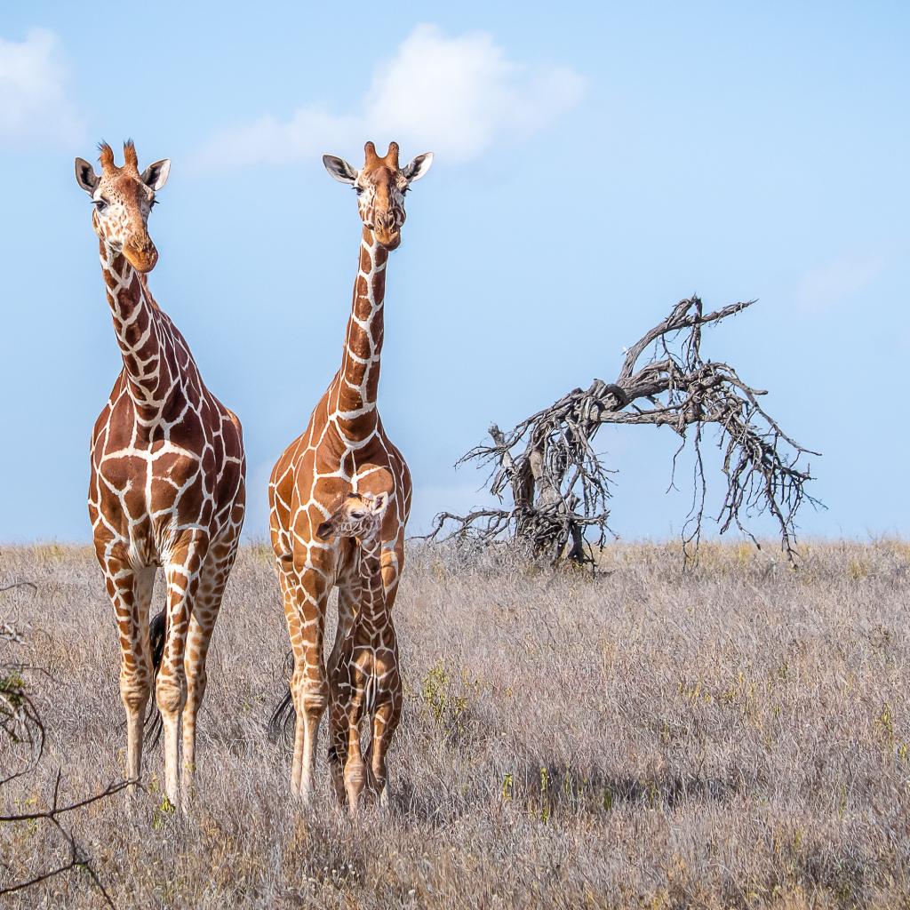Wallpaper Two giraffes walk on the dry grass in the savannah