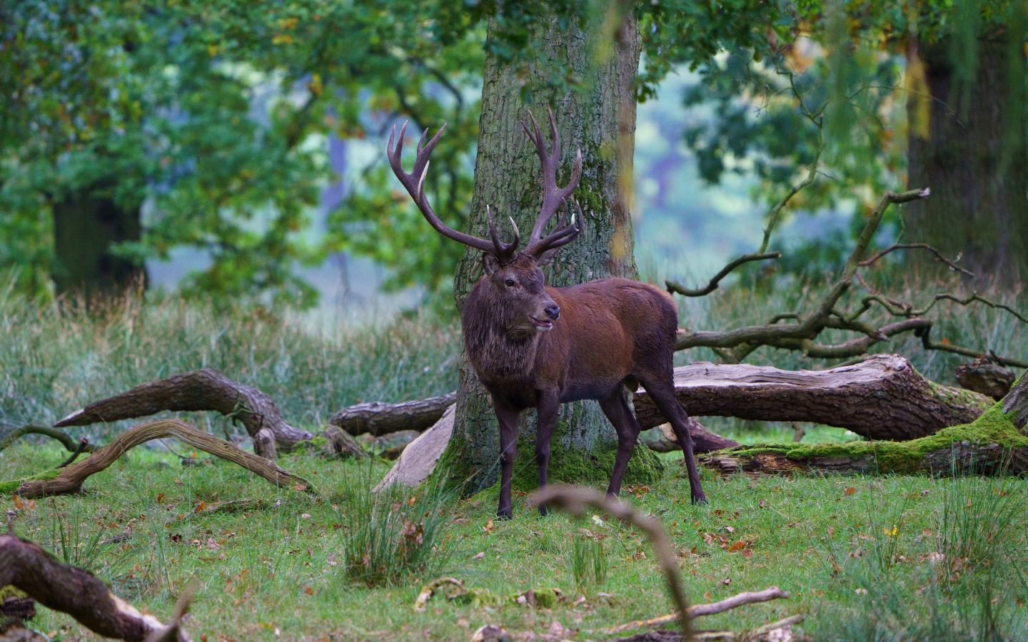 Wallpaper Deer with large antlers in the forest by the tree