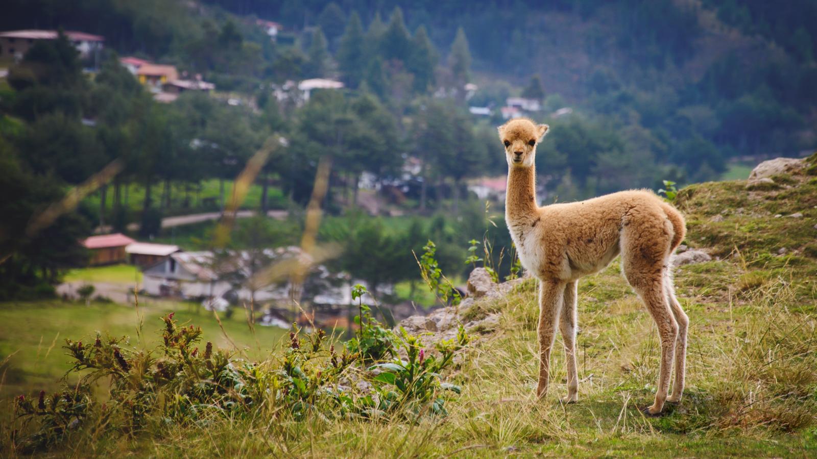 » Wallpaper Little vicuna grazing on the grass