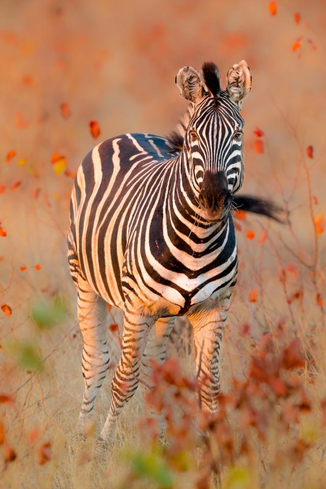 Wallpaper Striped zebra walking on dry grass