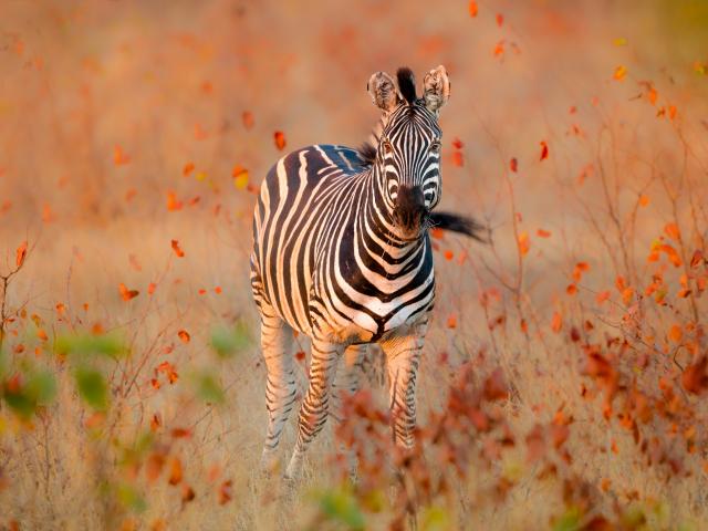 Wallpaper Striped zebra walking on dry grass