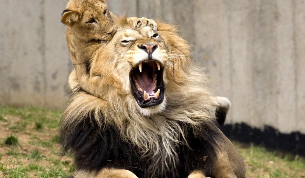 Wallpaper Little lion bit her father`s ear