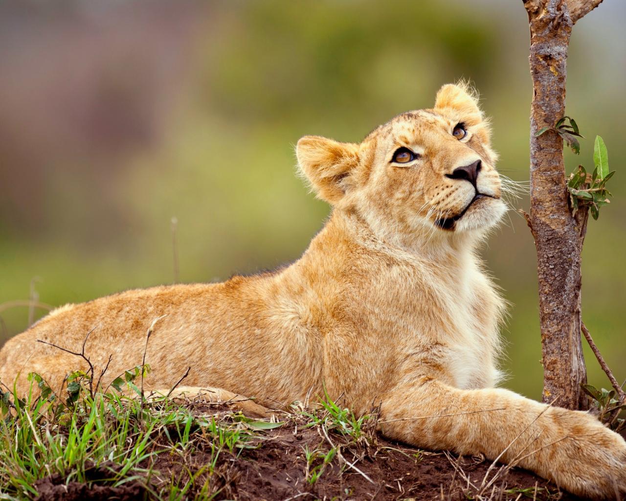 Wallpaper Little lion cub looking up